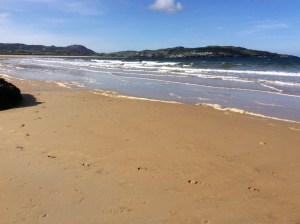 Stretches out on the sand and makes angels shapes with her arm and legs.