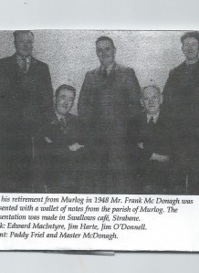 Master Mc Donagh was a much loved teacher. He taught in Murlog school from1920-1948. He lived in Derry and travelled to school on the train. The children walked with him every day which was unusual in those days as children did not talk to a teacher.